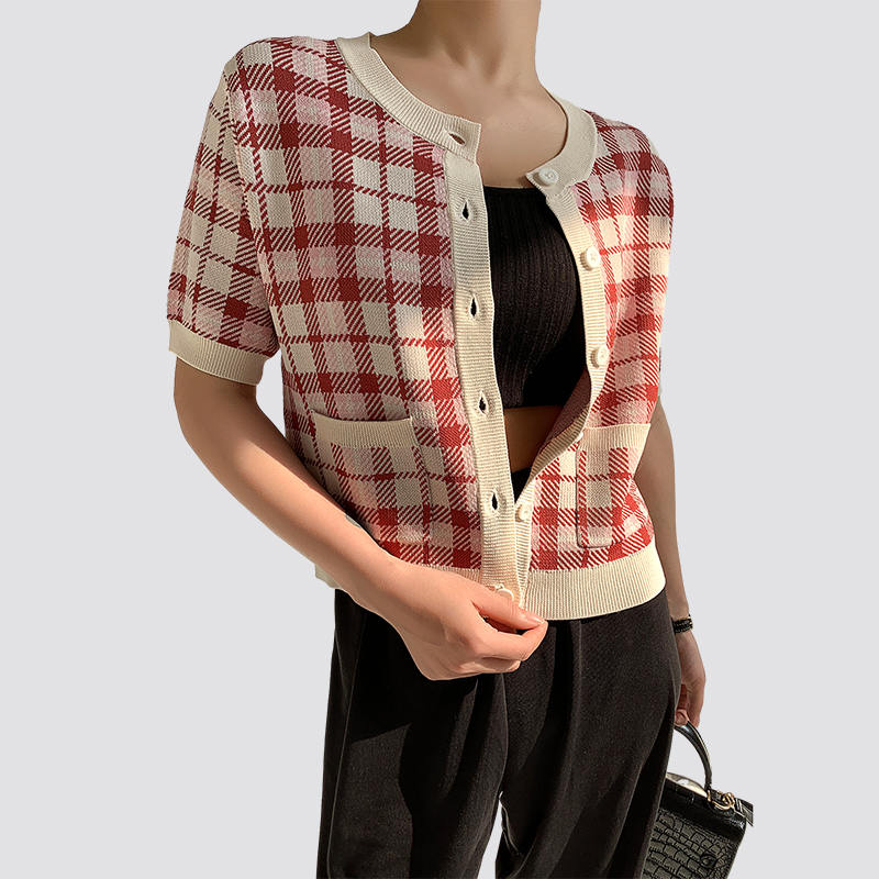 A cég elsősorban gyermek-, férfi- és női kötött pulóvereket gyárt. női rövid ujjú piros-fehér kockás kötött kardigán company in China.